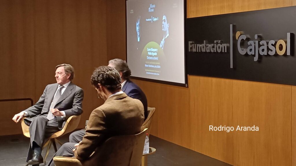 La Sala Antonio Machado de la sede de la Fundación Cajasol de Sevilla se ha convertido en la tarde noche de este martes 10 de febrero en el escenario del ciclo ‘Mano a Mano’ de la institución. En esta ocasión, el encuentro, desarrollado bajo el título ‘De torero a torero’, ha estado protagonizado por los matadores de toros Curro Vázquez y Pablo Aguado, y conducido por el periodista taurino José Enrique Moreno.