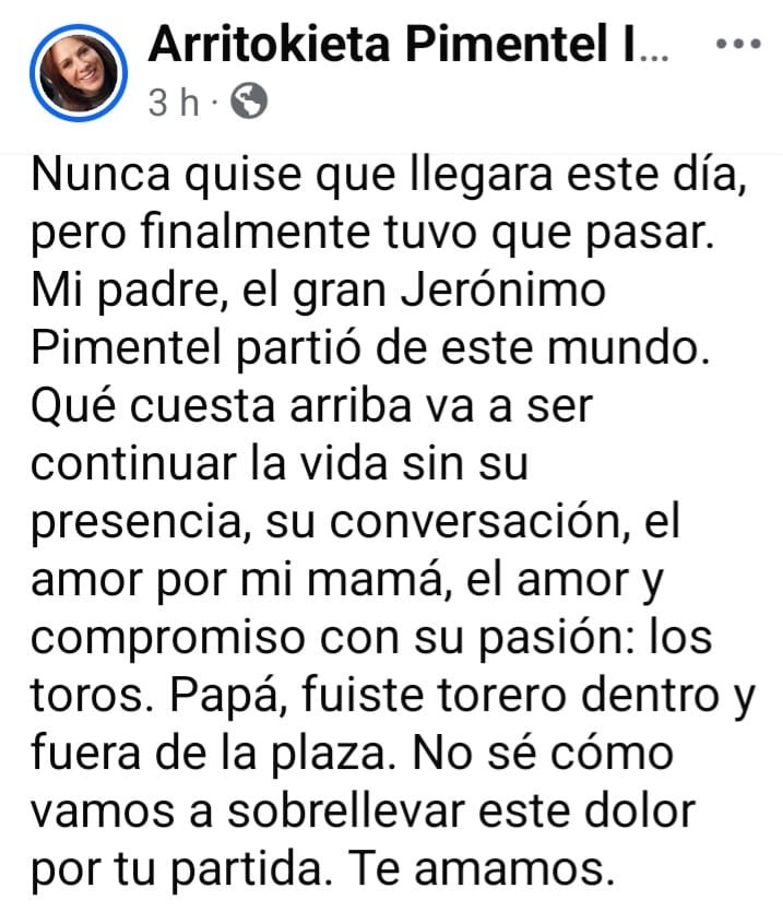 Descansa en paz MAESTRO JERÓNIMO PIMENTEL gracias por los grandes aportes a la fiesta Brava y gracias por el apoyo en los inicios del hoy matador David Martinez en la Escuela JERÓNIMO PIMENTEL DE CHOACHI Un abrazo hasta el Cielo.